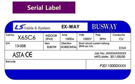 Tem thể hiện thông số chi tiết của Busway: Cấu hình, vật liệu, điện áp, dòng định mức, IP, ngày sản xuất, ký hiệu thứ tự thanh dẫn trên bản vẽ.